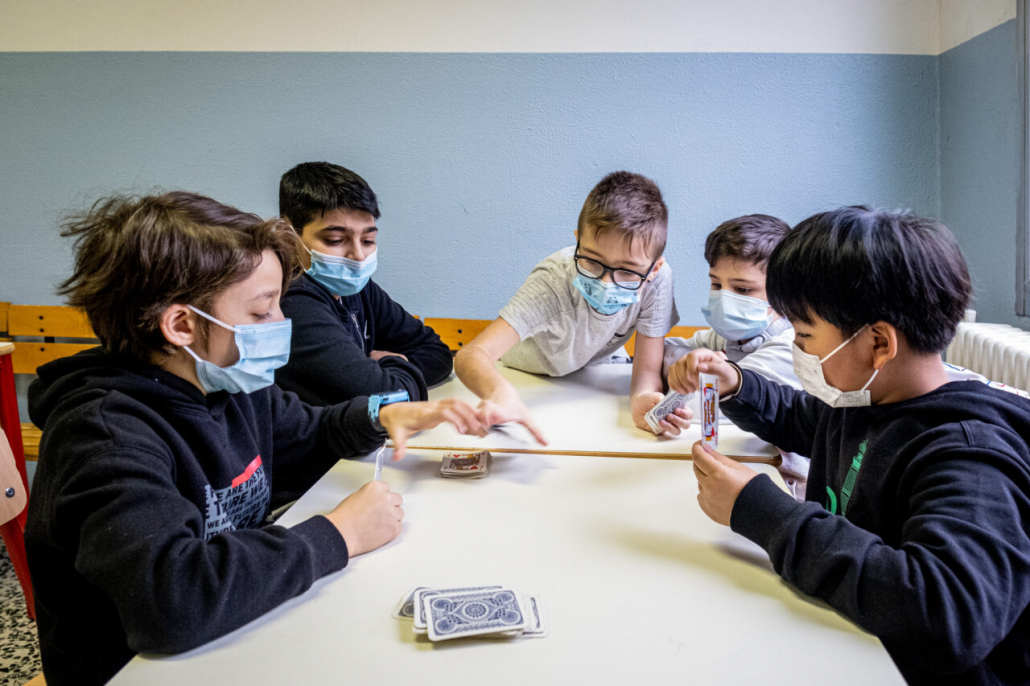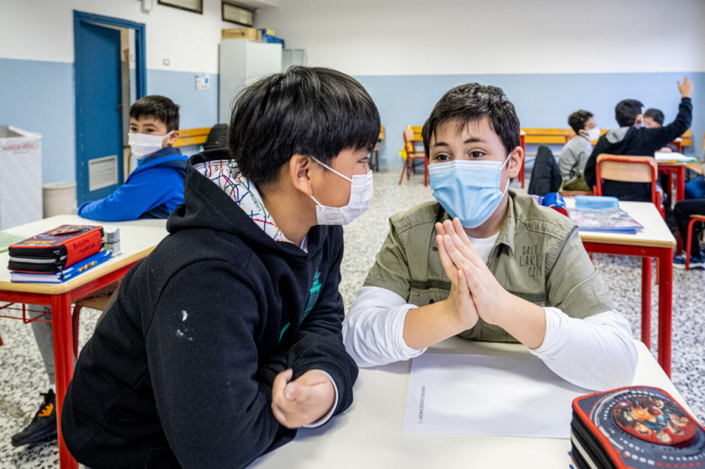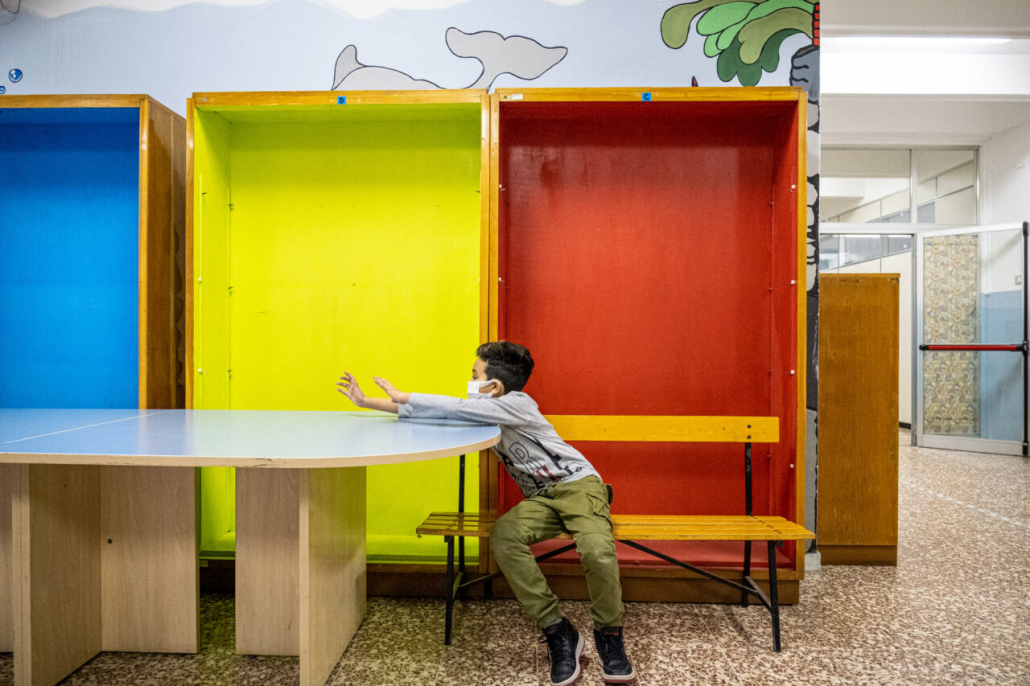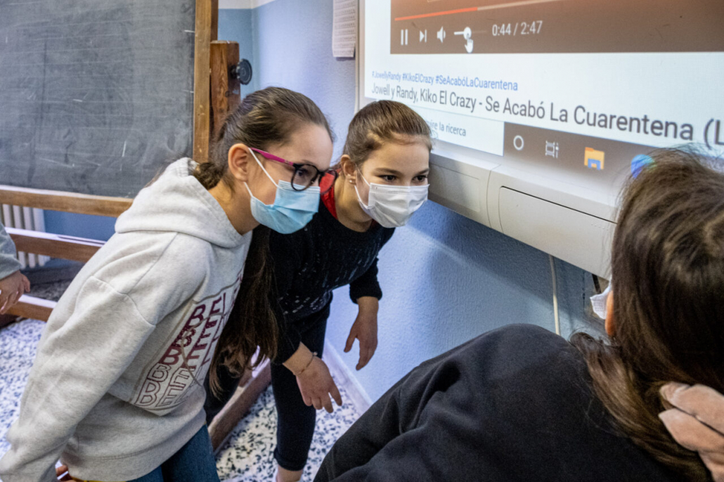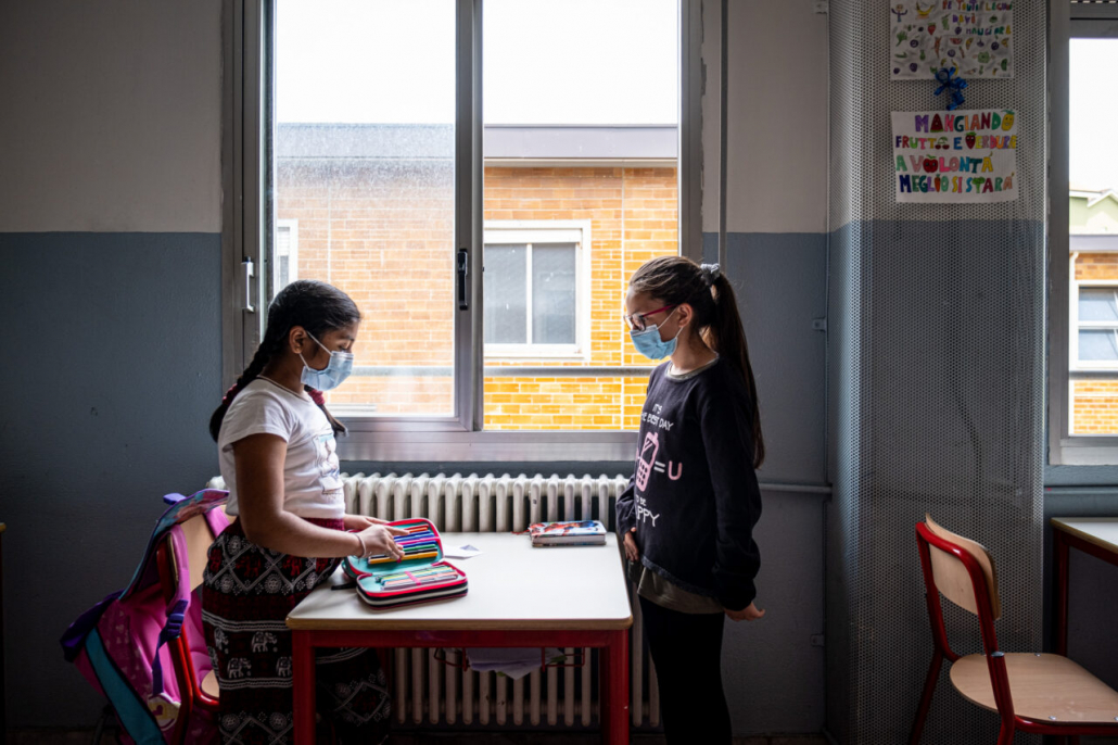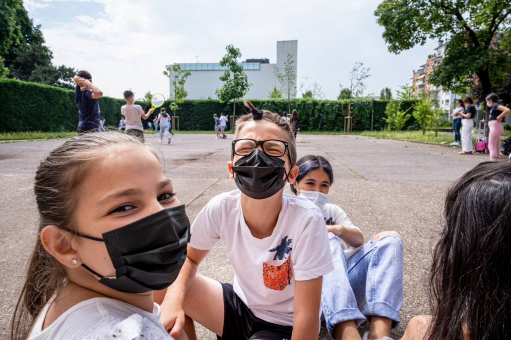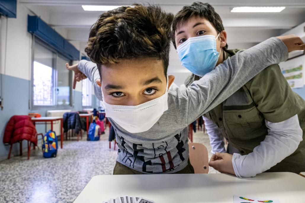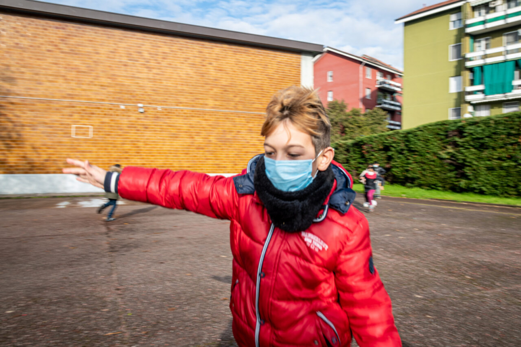 Ho cercato la risposta a questa domanda tra i banchi di una quarta elementare della periferia Milanese. I bambini della IV A dell’Istituto Trilussa, insieme alle loro maestre, mi hanno accolto da subito e per l’intero anno scolastico 2020/21 mi hanno lasciato girovagare tra i banchi, raccontandomi la novità del giorno, i nuovi disegni fatti, le conquiste ai videogiochi, la paura di rimanere contagiati e far stare a casa anche mamma e papà. Quando anche la scuola primaria ha chiuso, in piena zona rossa, mi hanno aperto le loro case durante le lezioni a distanza e lasciato partecipare ai laboratori online. Nella quotidianità scolastica ho cercato quello che di normale c’è in una situazione anormale, quello che di ordinario è rimasto fra i banchi di scuola, tra i flaconi di disinfettante e gli ingressi contingentati, quali espressioni si sono nascoste dietro le mascherine. I bambini sono bambini sempre, curiosi del mondo e pronti a scriverne il senso passo passo, giorno dopo giorno.
